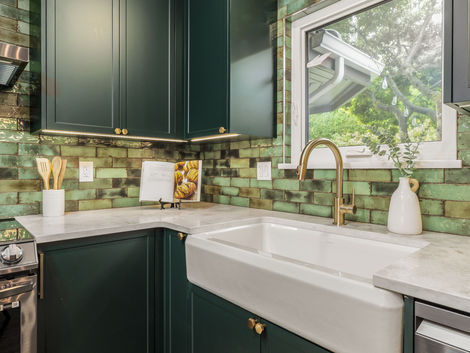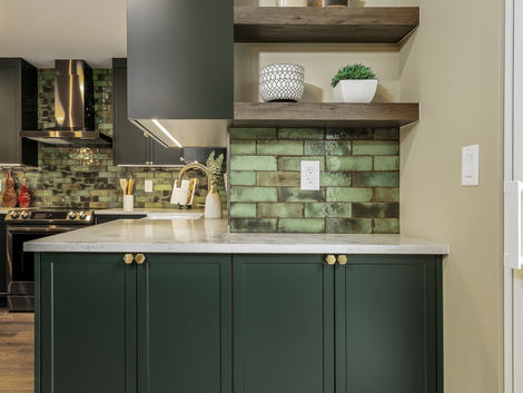 This renovation reflects the homeowner's love for dark, moody tones and natural vibes. Featuring black stainless steel appliances paired with dark green cabinetry and brass hardware accents, the space balances bold style with function. Removing the wall between the kitchen and dining room created an open layout with a large island and added pantry space-perfect for modern living.